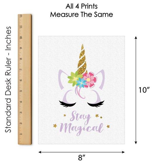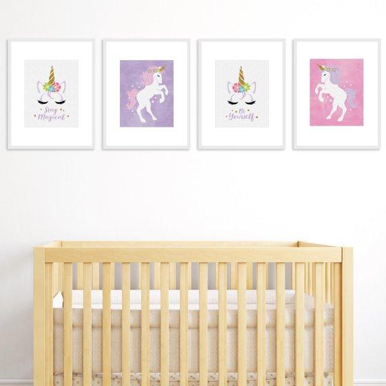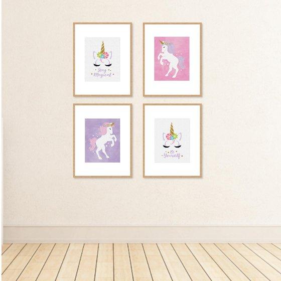 - Wall Art Set: Magical unicorn unframed prints are a coordinating set of 4 prints that will give your wall a pulled together look. This set is printed for vertical wall art display. Choose to display as gallery wall set or use each print to style 4 individual moments throughout your home.