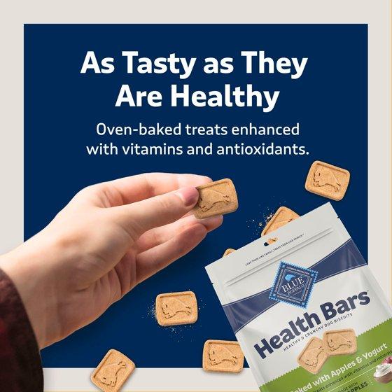 - MADE with APPLES: BLUE Health Bars dog treats prove that a healthy treat can be tasty, too; with ingredients like oatmeal, apples and yogurt, they feature the ingredients you’ll be proud to feed your furry family members