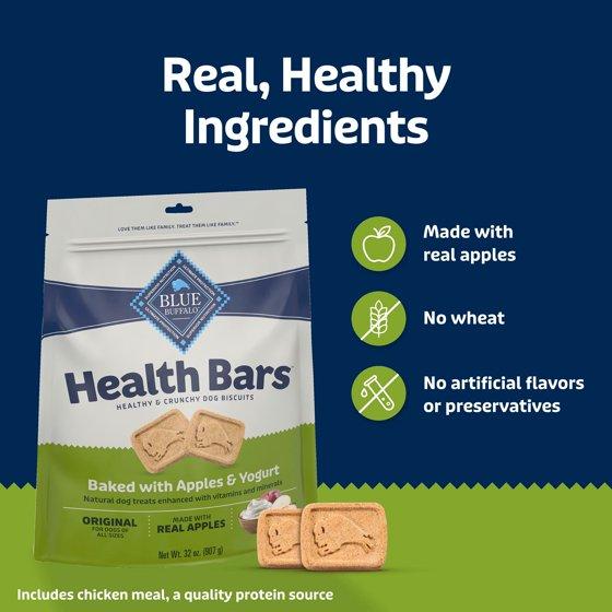 - INCLUDED IN PACKAGE: Contains One (1) 32-oz bag of BLUE Health Bars Crunchy Dog Biscuits, Oven-Baked with Natural Ingredients, Apples & Yogurt
