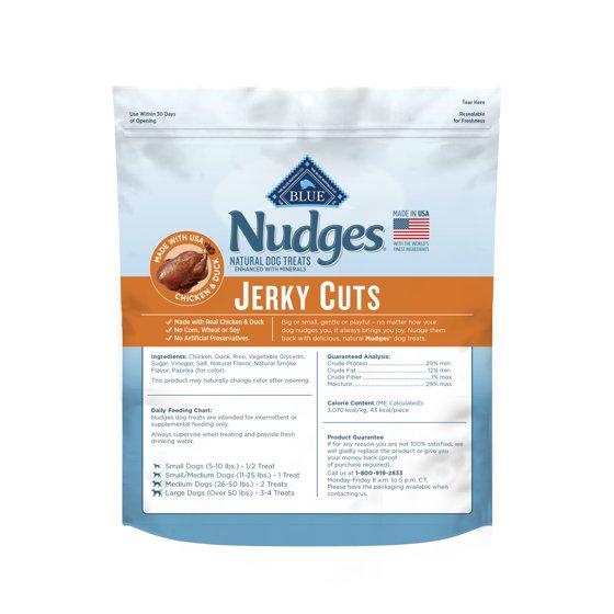- Contains: One (1) 8-oz. bag of BLUE Nudges Natural Jerky Cuts Dog Treats, Chicken & Duck Recipe
