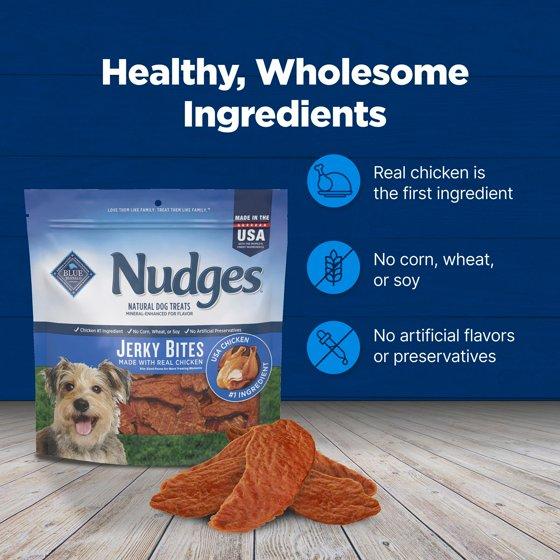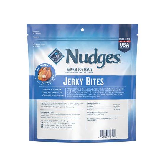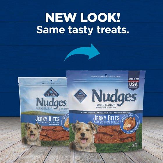 - PACKAGING MAY VARY: Contains One 16oz bags of BLUE Nudges Jerky Bites Natural Dog Treats, Chicken