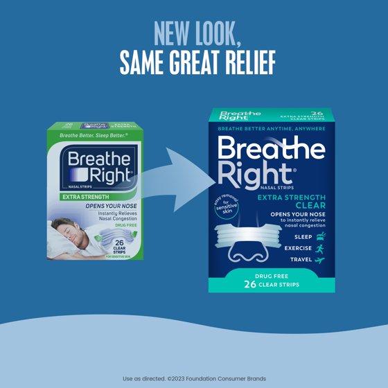 Breathe Right Extra Strength Nasal Strips work to instantly open your nose for nasal congestion relief you can feel right away. Breathe Right nasal strips alleviate your nasal congestion, whether from colds, allergies, or a deviated septum, by widening your nostrils, helping you take air in more easily. Each Breathe Right nasal strip is uniquely engineered with flexible “spring-like” bands and sticks to the area right above the flare of each nostril. As the bands attempt to straighten back to their original shape, they gently lift open the sides of the nose - instantly opening your nose for immediate relief. Our Extra Strength nasal strips are 50% stronger than our Original nasal strips and feature a hypoallergenic material specially made for those with sensitive skin. The strips are flexible, non-porous, and clear almost unnoticeable to the eye. Additionally, the Extra Strength Clear nasal strips can be used anytime, anywhere: as your go-to snoring strips, offering snoring relief, or being great for use during exercise, allowing for better breathing while working out or playing sports. Breathe Right is safe for adults and children over the age of 5. Breathe Right nasal strips may be used on a daily basis. Do not use for more than 12 hours per day. If rash or skin irritation occurs, discontinue use. Each strip is for single use only - do not reapply; use a fresh strip. Each nasal strip is individually sealed in its own wrapper for ease of use. Caution: Packaging of the product contains natural rubber latex which may cause allergic reactions.