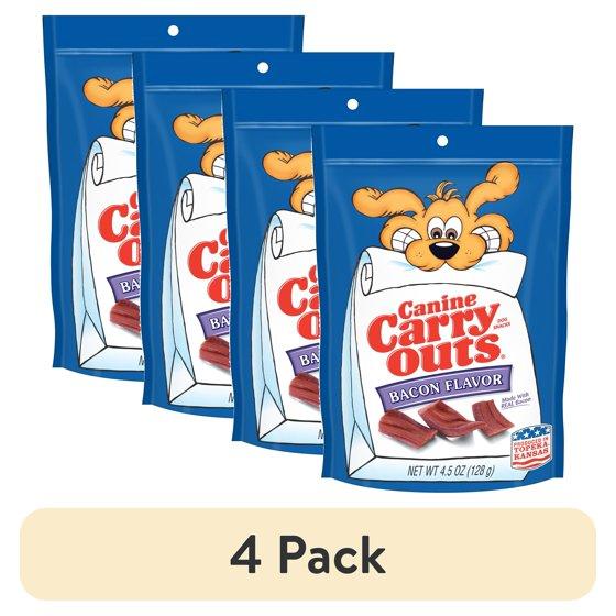 - Contains one (4) 4.5-ounce bag of Canine Carry Outs Bacon Flavor dog treats