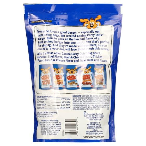 - Contains one (4) 22.5-ounce bag of Canine Carry Outs Burger Minis Beef Flavor dog treats