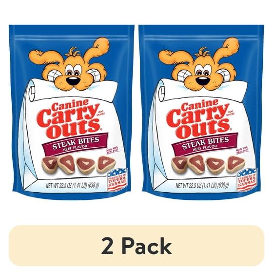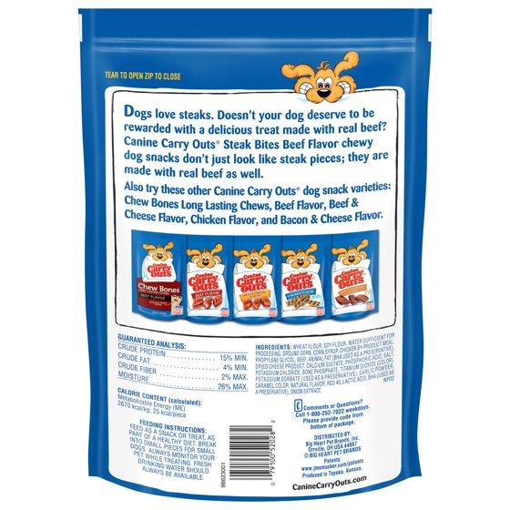 - Contains one (2) 22.5-ounce bag of Canine Carry Outs Steak Bites Beef Flavor dog treats