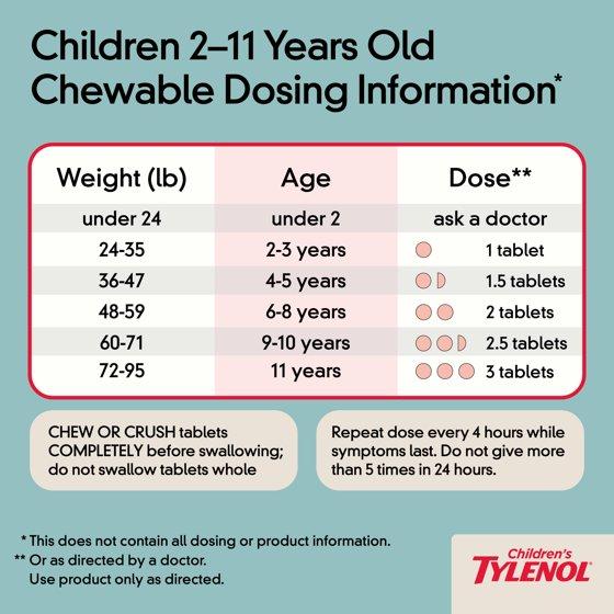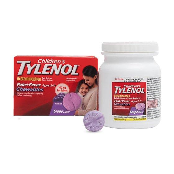 Intended for kids ages 2 to 11 years, Children's Tylenol Chewable Tablets with acetaminophen provide temporary relief from a range of kids' cold and flu symptoms, including minor aches and pains, headache and sore throat. Each chewable tablet contains 160 milligrams of the pain reliever and fever reducer acetaminophen to temporarily reduce fever and help relieve minor aches and pains due to the common cold, flu, sore throat, headache, and toothache. This children's cold & flu symptom medicine also comes in a kid-friendly grape flavor and is both ibuprofen-free and aspirin-free and is gentle on the tummy. Children's Tylenol Chewable Tablets come in grape flavor and are safe when used as directed by children ages 2-11. Tylenol is the Number 1 pediatrician recommended brand for pain & fever relief. Tylenol has been relied on by parents for over 60 years.