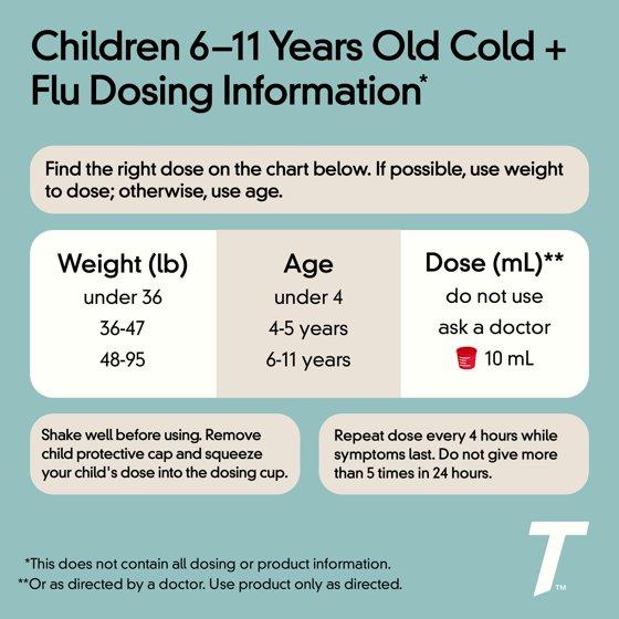 This product does not contain directions or complete warnings for adult use Do not give more than directed (see overdose warning) Shake well before using mL = milliliter Find right dose on chart below. If possible, use weight to dose; otherwise, use age. Remove the child protective cap and squeeze your child's dose into the dosing cup Repeat dose every 4 hours, while symptoms last Do not give more than 5 times in 24 hours Weight (lb), Age (yr), Dose (mL) under 36 (lb), under 4 years, do not use 36-47 (lb), 4 to 5 years, do not use unless directed by a doctor 48-95 (lb), 6 to 11 years, 10 mL Attention: use only enclosed dosing cup specifically designed for use with this product. Do not use any other dosing device.