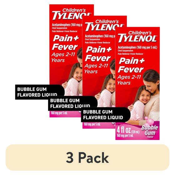 (3 pack) Children’s Tylenol Pain + Fever Relief Medicine, Bubble Gum, 4 fl. oz