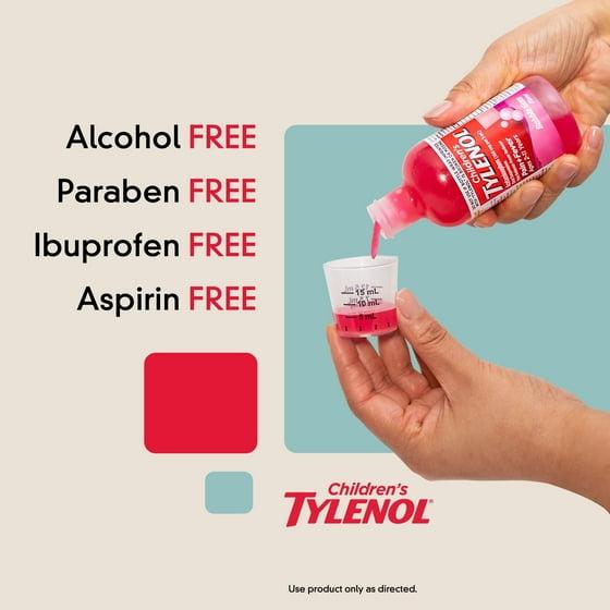 IMPORTANT: Please see dosing chart or ask a doctor for your child’s correct dose This product does not contain directions or complete warnings for adult use. Do not give more than directed (see overdose warning) Shake well before using mL = milliliter Find right dose on chart below. If possible, use weight to dose; otherwise, use age. Remove the child protective cap and squeeze your child's dose into the dosing cup Repeat dose every 4 hours while symptoms last Do not give more than 5 times in 24 hoursWeight (lb), Age (yr), Dose (mL)* under 24, under 2 years, ask a doctor 24-35 lbs, 2-3 years, 5 mL 36-47 lbs, 4-5 years, 7.5 mL 48-59 lbs, 6-8 years, 10 mL 60-71 lbs, 9-10 years, 12.5 mL 72-95 lbs, 11 years, 15 mL * or as directed by a doctor Attention: use only enclosed dosing cup specifically designed for use with this product. Do not use any other dosing device. Other information Each 5 mL contains: sodium 2 mg Store between 20-25°C (68-77°F) Do not use if carton is opened. Do not use if bottle wrap imprinted with “TYLENOL” is broken or missing Questions or comments?