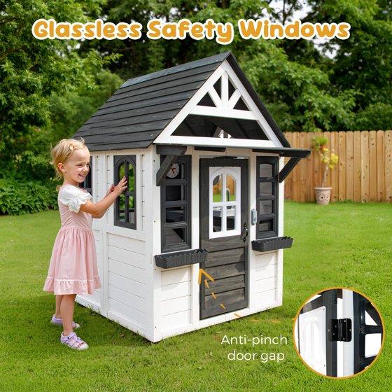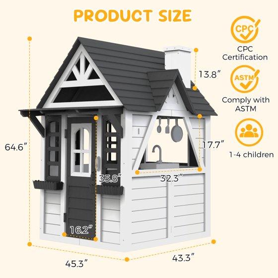 COCLUB Wooden Outdoor Playhouse for Kids Ages 4-8 – Spark imagination with this charming outdoor play house! Designed as a kids outdoor playhouse with a realistic cottage style, it features a working doorbell, Phone, flower pot holders, and a fully-equipped kitchen (includes pots, pans, and sink) – perfect for playhouses for kids ages 4-8. The outdoor house for kids also includes a pet-friendly door with curtains, allowing dogs or cats to join the fun, making it ideal for family bonding. Foster creativity and learning with two teaching clocks and role-play activities in this playhouse for kids outdoors, designed to boost cognitive skills and social interaction. Safety is prioritized with child-safe materials: splinter-free wood, shatterproof windows, and BPA-free plastic tools.This kids play house is easy to assemble with pre-cut panels and includes 24/7 support. Measuring 45”L x 43”W x 65”H, it’s the ultimate kids outdoor play equipment for backyard adventures.