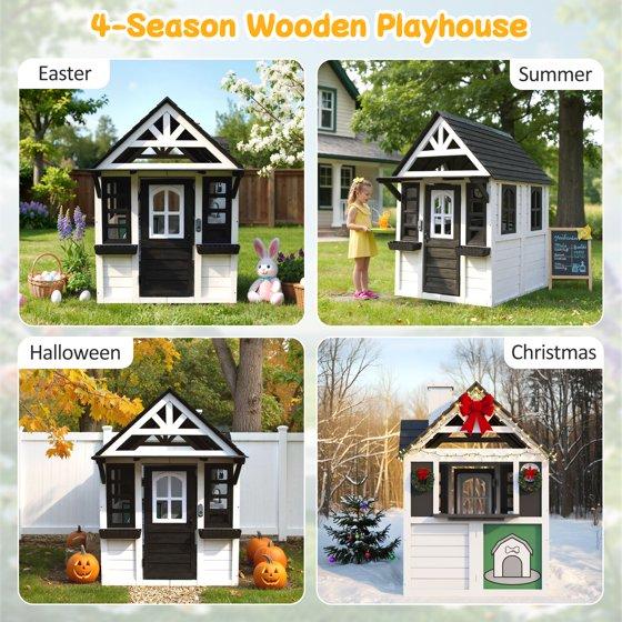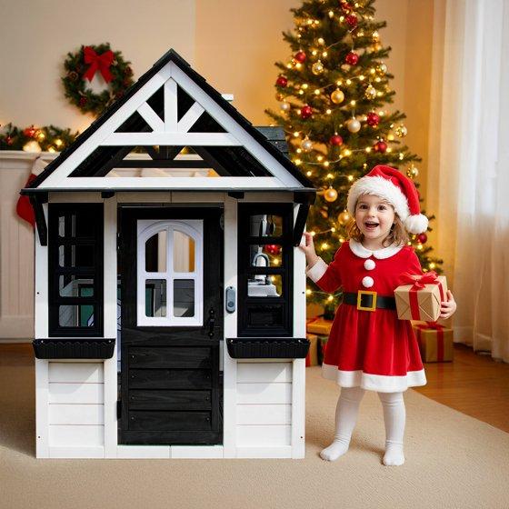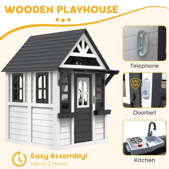 COCLUB Outdoor Playhouse for Kids Ages 4-8, Wooden Play House with Doorbell, Phone, Kitchen Toys, Outdoor Kids Play Equipment, Casa Para Niñas (45”L x 65”H), White & Black