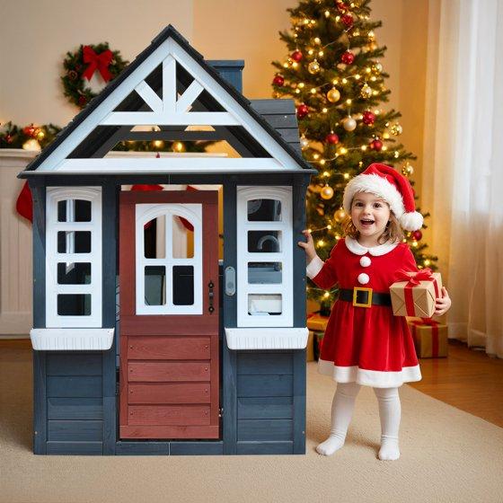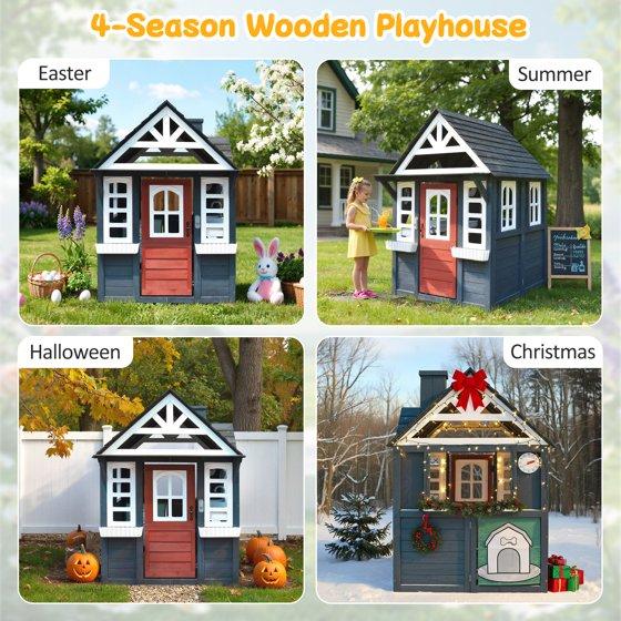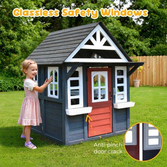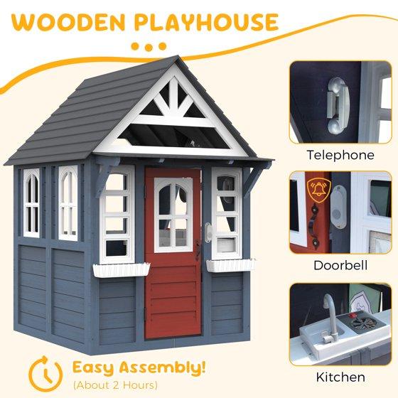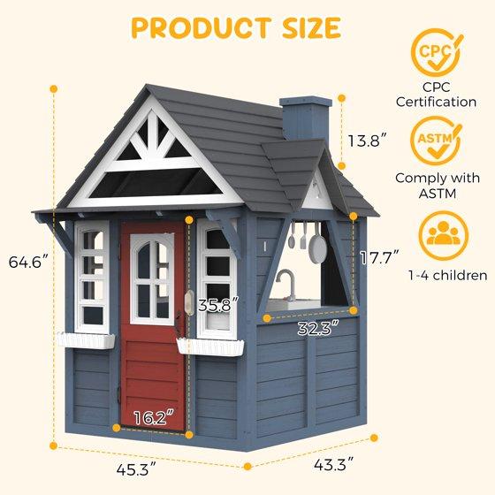 COCLUB Wooden Outdoor Playhouse for Kids Ages 4-8 – Spark imagination with this charming outdoor play house! Designed as a kids outdoor playhouse with a realistic cottage style, it features a working doorbell, Phone, flower pot holders, and a fully-equipped kitchen (includes pots, pans, and sink) – perfect for playhouses for kids ages 4-8. The outdoor house for kids also includes a pet-friendly door with curtains, allowing dogs or cats to join the fun, making it ideal for family bonding. Foster creativity and learning with two teaching clocks and role-play activities in this playhouse for kids outdoors, designed to boost cognitive skills and social interaction. Safety is prioritized with child-safe materials: splinter-free wood, shatterproof windows, and BPA-free plastic tools.This kids play house is easy to assemble with pre-cut panels and includes 24/7 support. Measuring 45”L x 43”W x 65”H, it’s the ultimate kids outdoor play equipment for backyard adventures.