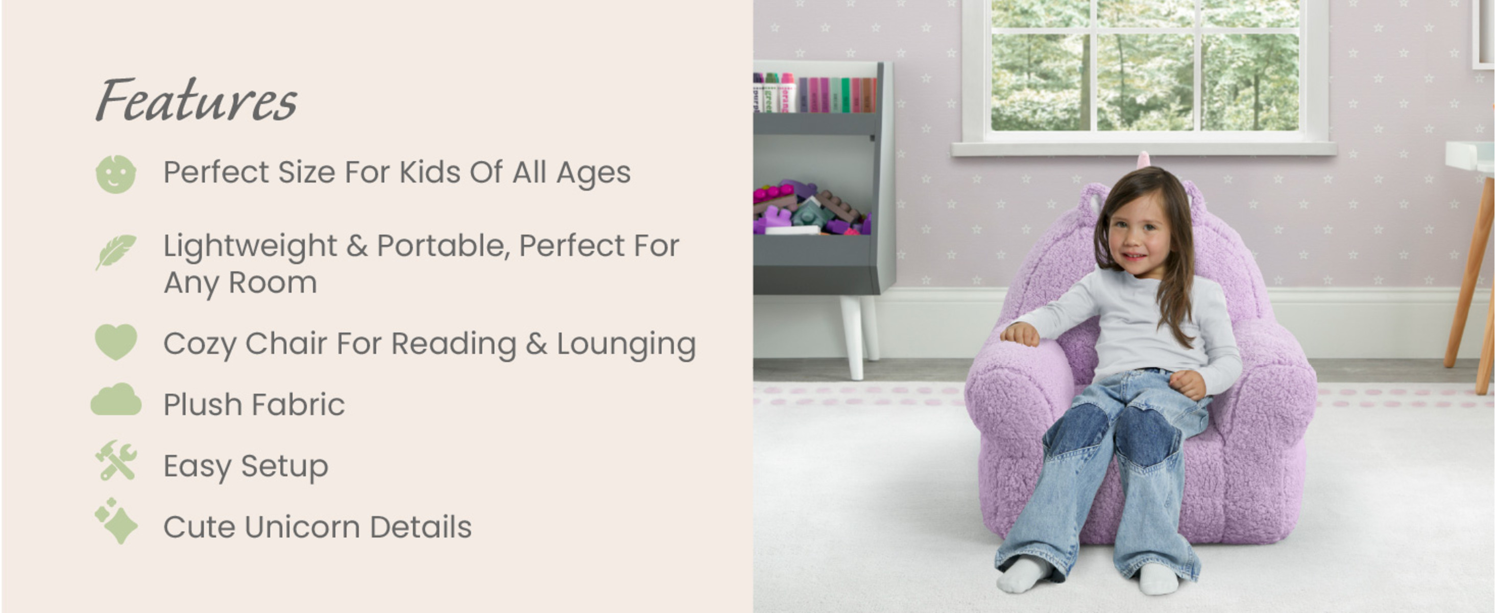 - FOR UNICORN FANS: This plush chair features cool unicorn details | This chair will be your child’s cuddly companion for reading, relaxing or snuggling