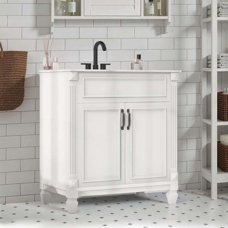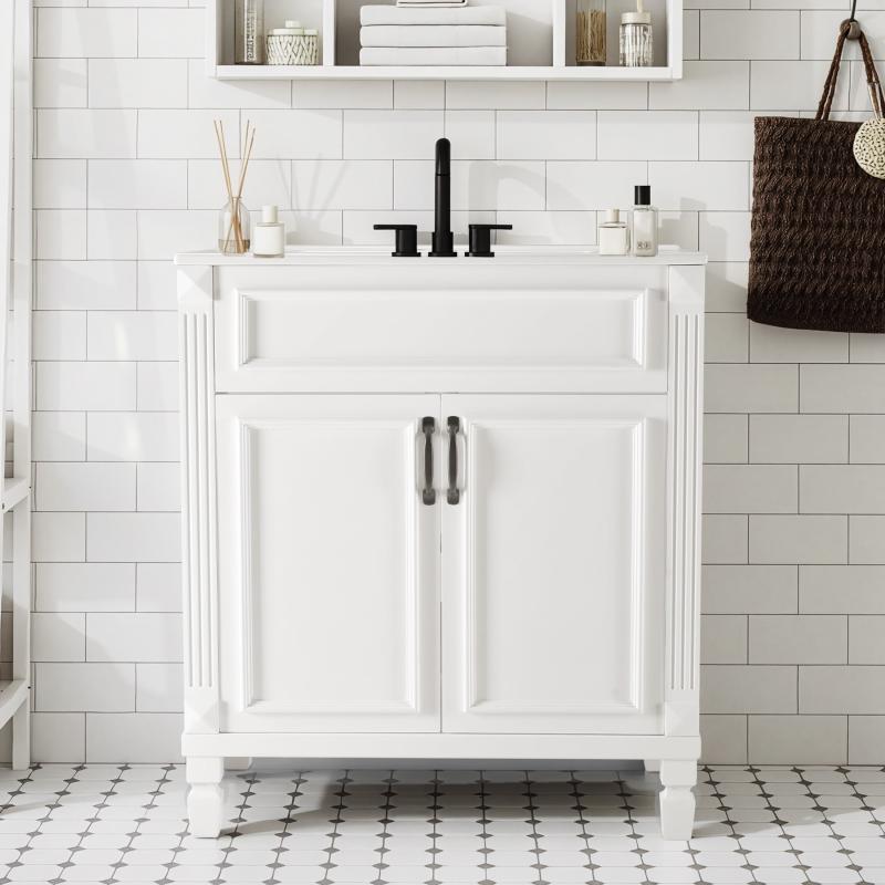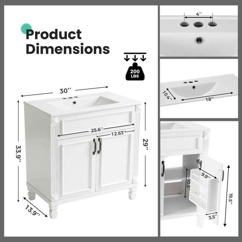 - 【Fashionable and Durable】This 30-inch bathroom vanity with a sink perfectly combines durability, style, and practicality. The modern minimalist white bathroom vanity adds a touch of fashion to your bathroom, enhancing the overall aesthetic while maintaining a clean and tidy appearance. Made with a sturdy medium-density fiberboard base, it provides solid support and stability. The drawers can hold up to 50 lbs, and the countertop can hold up to 200 lbs.