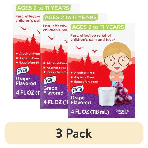 (3 pack) Equate Children's Pain & Fever Acetaminophen Oral Suspension, 160 mg, Grape Flavor, Ages 2 to 11 Years, 4 fl oz, Compare to Children's Tylenol® Oral Suspension Active Ingredient