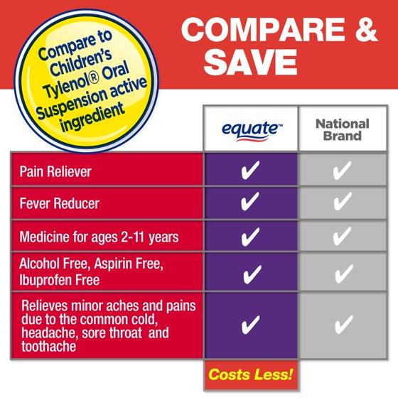 - Active Ingredient: Equate Children's Pain and Fever contains acetaminophen 160 mg per 5 mL, which is a pain reliever and fever reducer; compare to the active ingredient in Children's Tylenol Oral Suspension