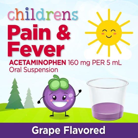 Compare to the active ingredient of Children’s Tylenol Oral Suspension. Rely on Equate Children's Pain and Fever, Acetaminophen 160 mg/5 mL to help your child feel better from aches, pains and fever. This grape flavored pain reliever and fever reducer provides fast and effective relief from minor aches and pains due to the common cold, flu, headache, sore throat and toothache. It also helps to temporarily reduce fever. Equate Children's Pain and Fever, Acetaminophen 160 mg/5 mL is free of parabens, alcohol, aspirin, ibuprofen and gluten. This liquid medicine is for children ages 2 to 11 years. Features a child-resistant safety cap. Dosage cup included.