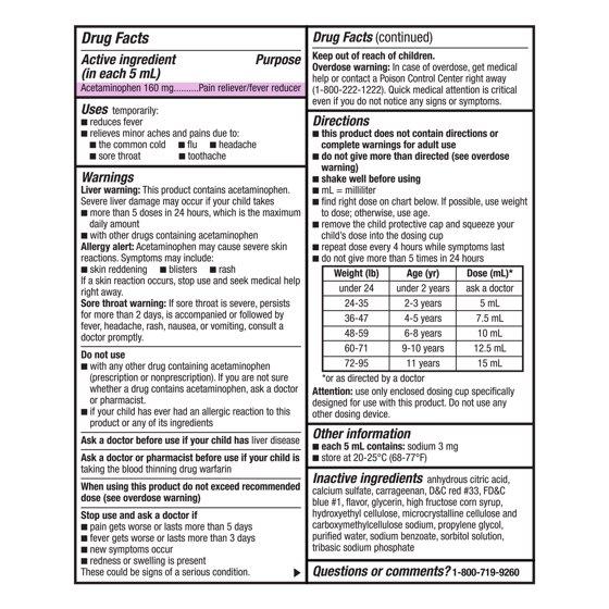 Active ingredient (in each 5 mL): Acetaminophen 160 mg. Inactive ingredients: anhydrous citric acid, calcium sulfate, carrageenan, D&C red #33, FD&C blue #1, flavor, glycerin, high fructose corn syrup, hydroxyethyl cellulose, microcrystalline cellulose and carboxymethylcellulose sodium, propylene glycol, purified water, sodium benzoate, sorbitol solution, tribasic sodium phosphate