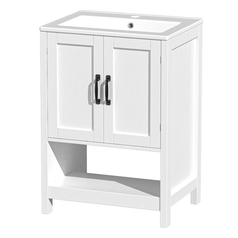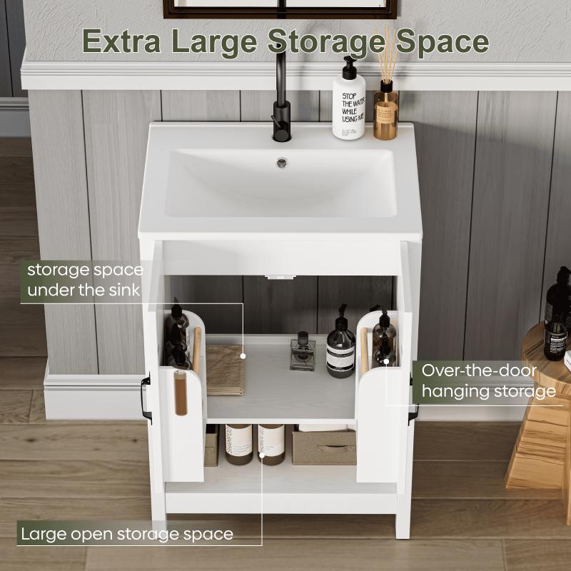 - Sleek Modern Design for Any Bathroom: The EVOKEDEN 24" bathroom vanity effortlessly complements all bathroom decor styles, featuring crisp white wood panels paired with black handles and hinges for a clean, timeless modern aesthetic. Built-in door organizers optimize internal space, reducing clutter and creating extra functional storage for your daily bathroom needs.