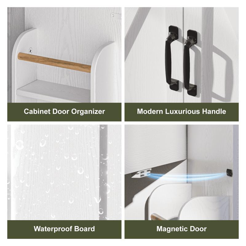 - Spacious & Smart Storage Solution: This bathroom cabinet delivers ample storage with two soft-close cabinet doors, perfect for stowing all your toiletries and bathroom essentials. Tall and short items alike-from cleaning supplies to body wash and lotions-fit neatly for easy access and organization. Additional door-mounted organizers boost storage capacity even further, making the most of every inch of space.
