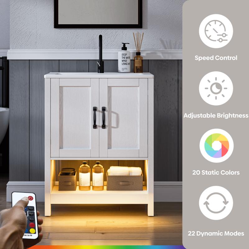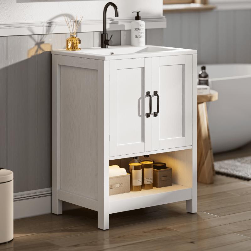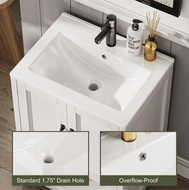 - Premium Water-Resistant Construction: Crafted for long-lasting use in humid bathroom environments, the vanity is made of durable water-resistant density board. It includes an integrated high-density ceramic white sink with a premium glossy glaze-stylish, scratch-resistant, and ultra-easy to clean. The generous 24"×18" countertop offers extra room for daily use, while the sturdy ceramic sink ensures lasting durability.