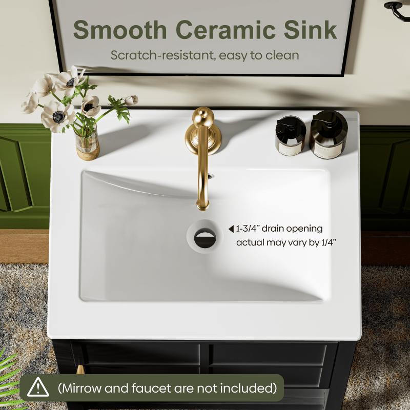 - Premium Water-Resistant Construction: Made of durable water-resistant density board, this vanity endures humid bathrooms. The integrated white sink is sleek and sturdy, paired with a 24"×18" spacious countertop. High-density ceramic with a glossy glaze resists stains and is easy to clean.