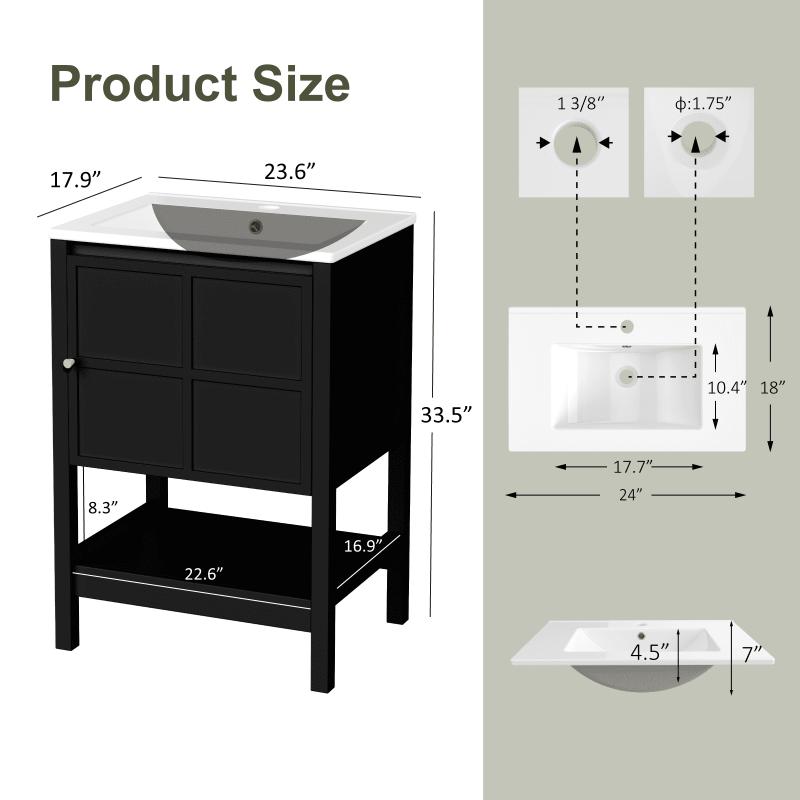 - Overall Dimensions & Practical Details: Measuring 24"L x 18.3"W x 33.7"H, it fits most bathrooms. The sink has a standard 1.75-inch drain hole for smooth drainage. Contact us anytime for questions or assistance.