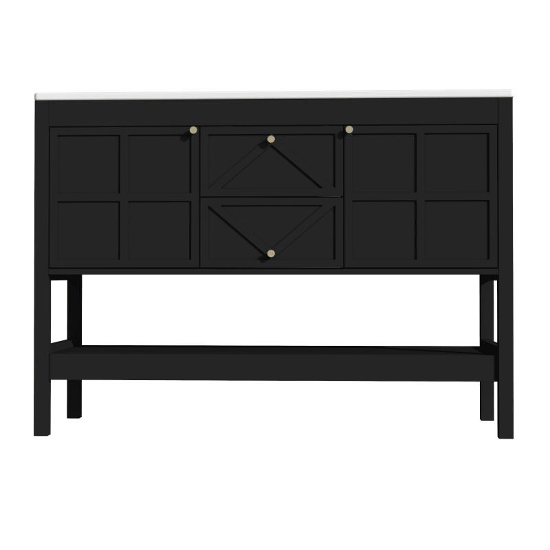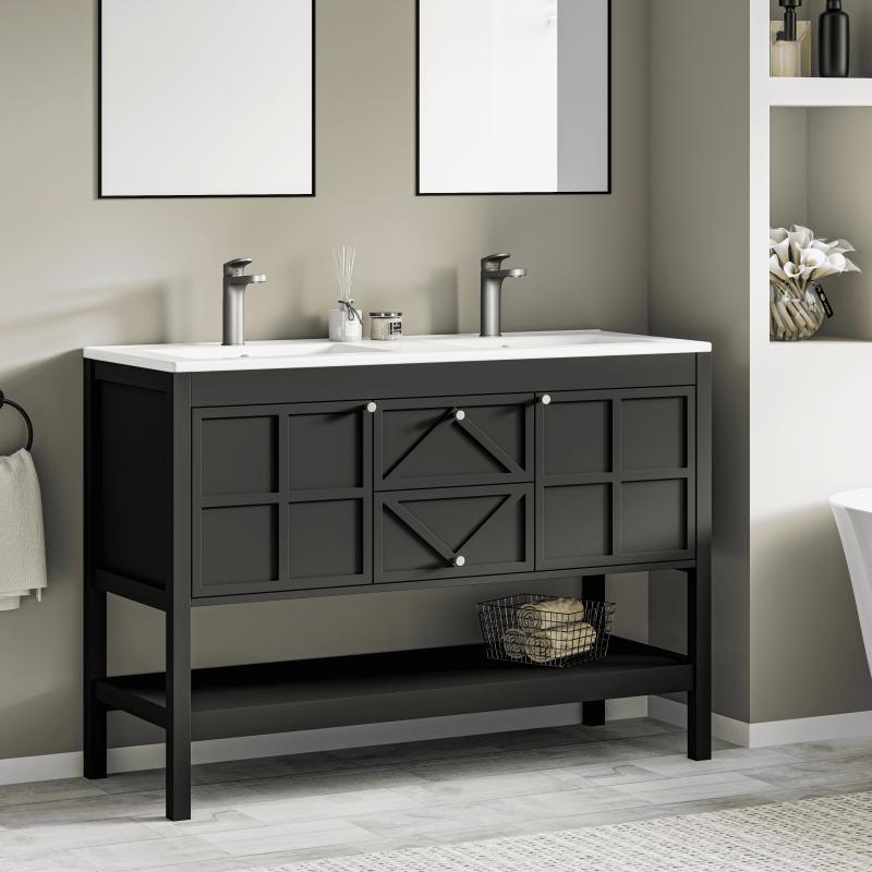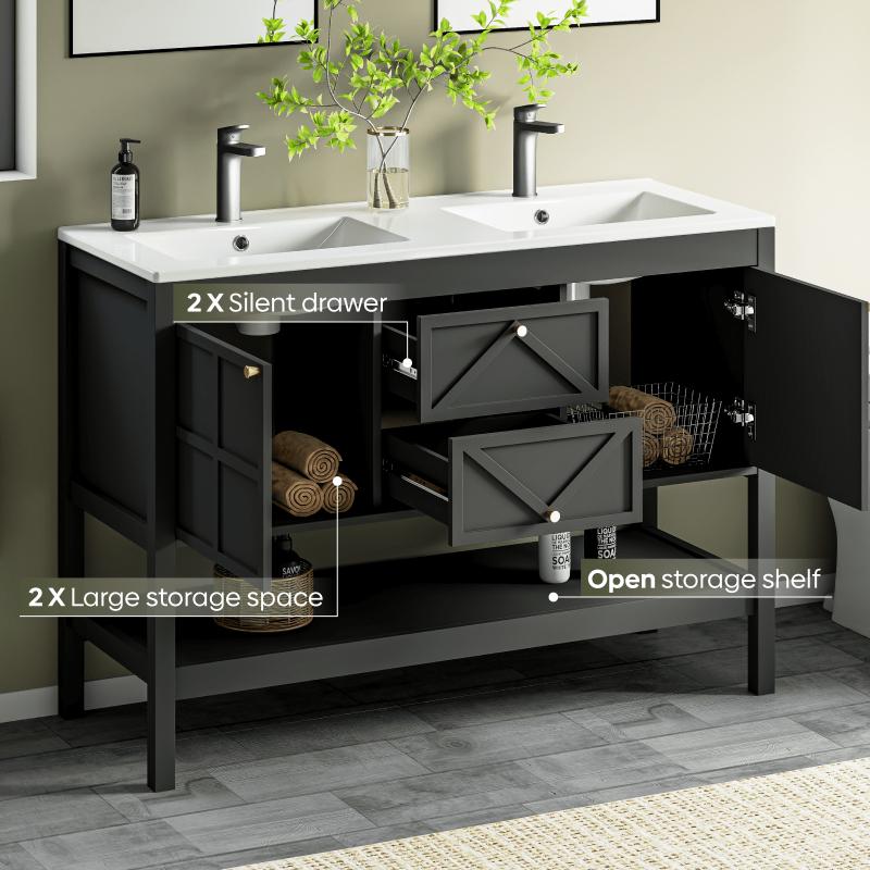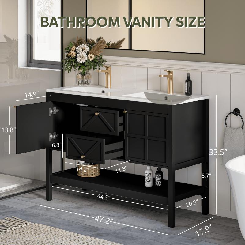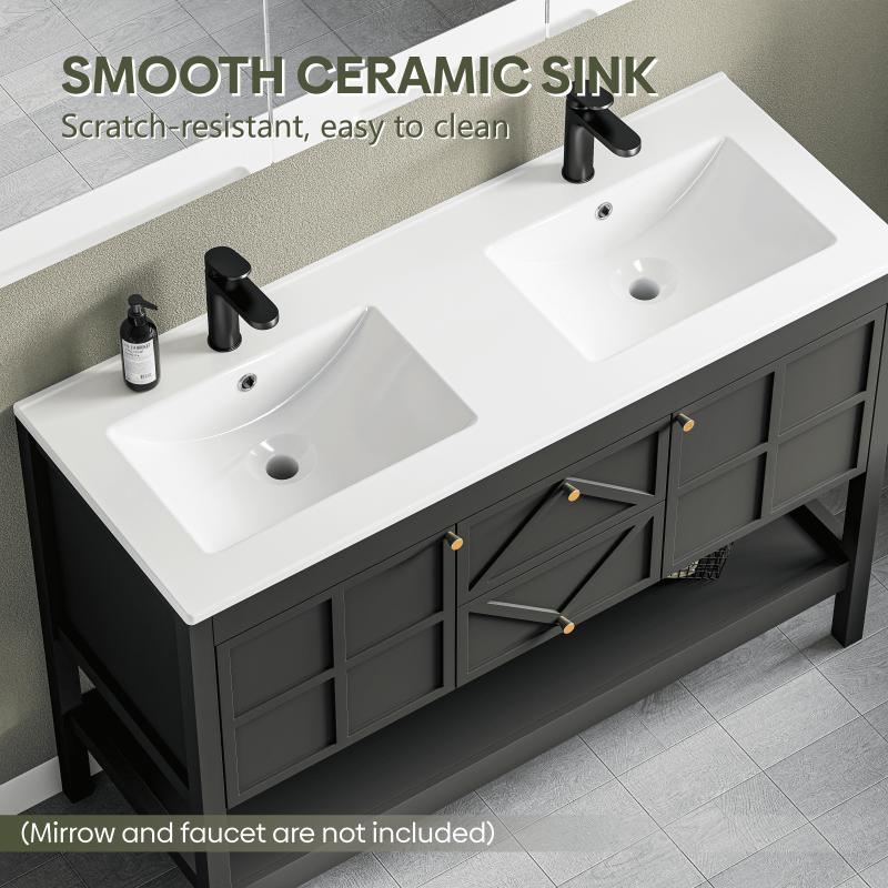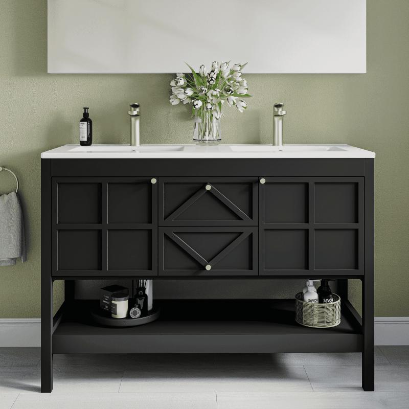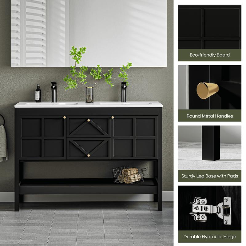 - Premium Water-Resistant Construction: Built to thrive in humid bathrooms, this vanity features a durable density board frame and an integrated high-density ceramic sink. Its generous 48"×18" countertop offers ample space, and the glossy glaze ensures effortless cleaning. The convenient double-basin design is perfect for family use, balancing durability and aesthetic appeal.