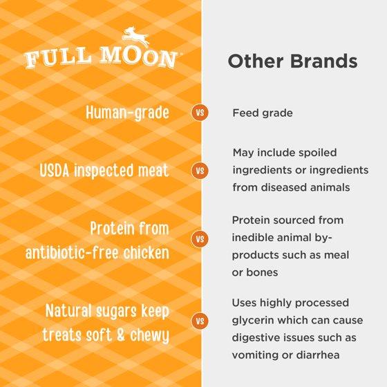 - .-GROWN CHICKEN: Full Moon treats are proudly using regionally sourced ingredients, including USDA-approved, antibiotic-free. No Antibiotics Ever Chicken