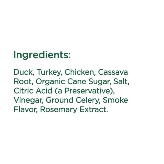 Duck, Turkey, Chicken, Cassava Root, Organic Cane Sugar, Salt, Citric Acid (a Preservative), Vinegar, Ground Celery, Smoke Flavor, Rosemary Extract.