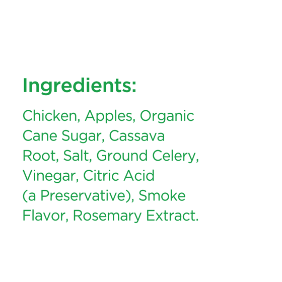 Chicken, Apples, Organic Cane Sugar, Cassava Root, Salt, Ground Celery, Vinegar, Citric Acid (a Preservative), Smoke Flavor Rosemary Extract.