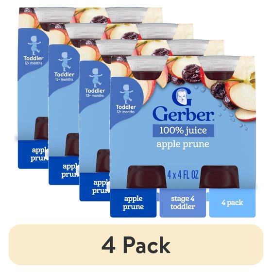 - Six 4 ct packs of 4 fl oz bottles of Gerber 100% Apple Prune Fruit Juice