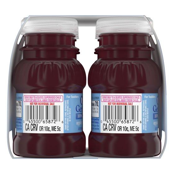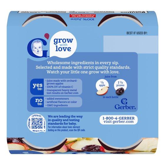 - Six 4 ct packs of 4 fl oz bottles of Gerber 100% Apple Prune Fruit Juice