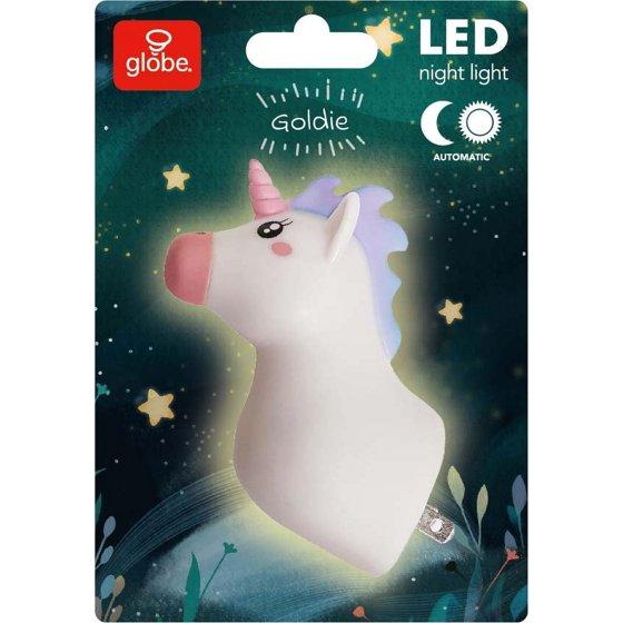 Globe Electric's Goldie Unicorn Automatic Plug-In Night Light is perfect for a baby nursery, toddler's bedroom, or bathroom. It turns on at dusk and off at dawn so you'll always have a nice fun night lamp when needed. Staying cool to the touch you never have to worry about where you're placing your kids night light. Costing only pennies to operate, the long-lasting LED saves you time and energy and will be around for years to come. Perfect for the unicorn lover in your family. This item weighs 0.11 lbs.