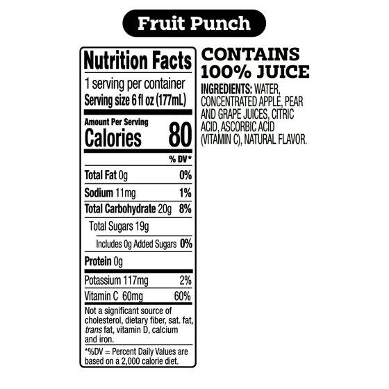 Water, Concentrated Apple,Pear and Grape Juices, Citric Acid, Ascorbic Acid(Vitamin C), Natural Fruit Punch Flavor