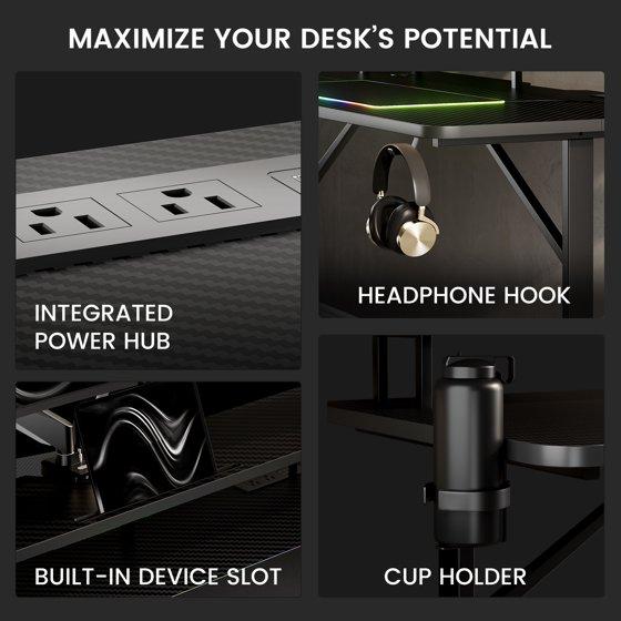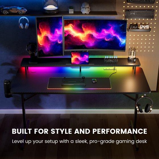 GTRACING Lumina Elite LED Gaming Desk with USB and Power Outlets, for Home and Office, Monitor Stand and Wireless Charging, Black