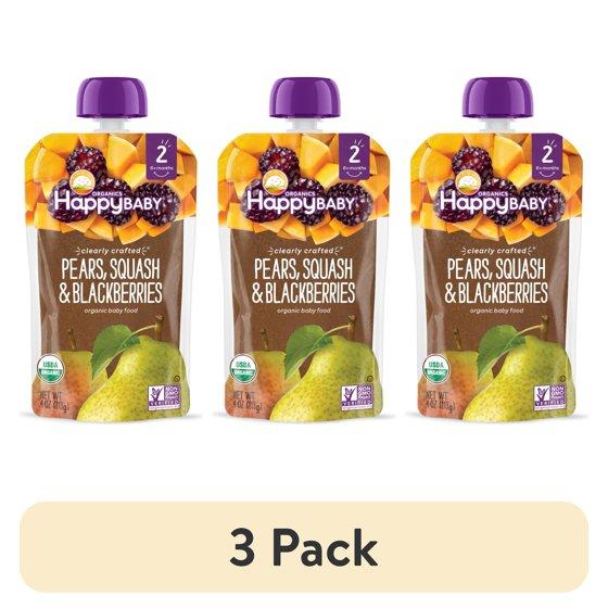 (3 pack) Happy Baby, Clearly Crafted, Stage 2 Baby Food, Pears, Squash & Blackberries, 4 oz Pouch