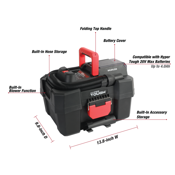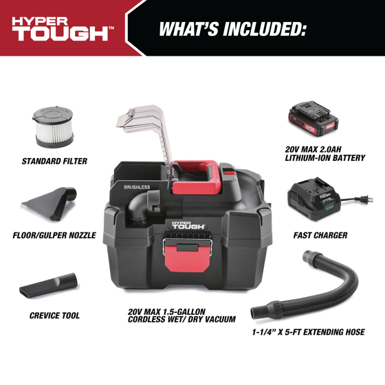 - Hyper Tough 1.5 Gallon Wet Dry Vac, 20V Max, Brushless Motor, Cordless, Battery and Charger Included