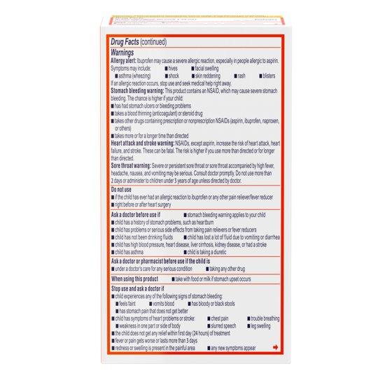 Active Ingredient (in each 1.25 mL): Ibuprofen 50 mg (NSAID)* *nonsteroidal anti-inflammatory drug Inactive Ingredients: anhydrous citric acid, caramel, FD&C red no. 40, flavors, glycerin, polysorbate 80, pregelatinized starch, purified water, sodium benzoate, sorbitol solution, sucrose, xanthan gum