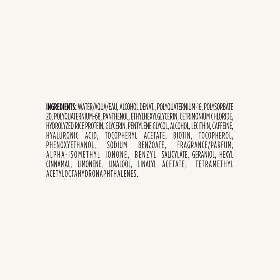 Water/Aqua/Eau, Alcohol Denat., Polyquaternium-16, Polysorbate 20, Polyquaternium-68, Panthenol, Ethylhexylglycerin, Cetrimonium Chloride, Hydrolyzed Rice Protein, Glycerin, Pentylene Glycol, Alcohol, Lecithin, Caffeine, Hyaluronic Acid, Tocopheryl Acetate, Biotin, Tocopherol, Phenoxyethanol, Sodium Benzoate, Fragrance/Parfum, Alpha-Isomethyl Ionone, Benzyl Salicylate, Geraniol, Hexyl Cinnamal, Limonene, Linalool, Linalyl Acetate, Tetramethyl Acetyloctahydronaphthalenes