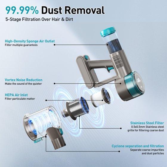 - [99.99% Efficiency Filtration System] KANFUAQ cordless stick vacuum cleaner has a 5-stage high-efficiency filtration system and washable HEPA filters that can capture up to 99.99% of microscopic fine particles as small as 0.1 microns, so you can rest assured that your home is being kept nice and clean!