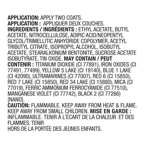 INGREDIENTS / INGRÉDIENTS : ETHYL ACETATE, BUTYL ACETATE, NITROCELLULOSE, ADIPIC ACID/NEOPENTYL GLYCOL/TRIMELLITIC ANHYDRIDE COPOLYMER, ACETYL TRIBUTYL CITRATE, ISOPROPYL ALCOHOL, ISOBUTYL ACETATE, STEARALKONIUM BENTONITE, SUCROSE ACETATE ISOBUTYRATE. MAY CONTAIN / PEUT CONTENIR : TITANIUM DIOXIDE (CI 77891), IRON OXIDE BLACK (CI 77499), BLACK 2 (CI 77266), YELLOW 5 LAKE (CI 19140), YELLOW 10 LAKE (CI 47005), BLUE 1 LAKE (CI 42090), ULTRAMARINES (CI 77007), RED 6 (CI 15850), RED 7 LAKE (CI 15850), RED 34 LAKE (CI 15880), MANGANESE VIOLET (CI 77742).