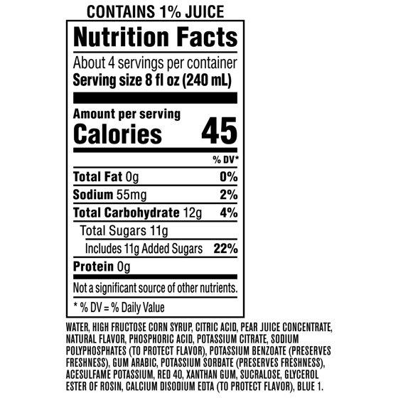 Water, High Fructose Corn Syrup, Citric Acid, Pear Juice Concentrate, Natural Flavor, Phosphoric Acid, Potassium Citrate, Sodium Hexametaphosphate (to Protect Flavor), Potassium Benzoate (Preserves Freshness), Gum Arabic, Potassium Sorbate (Preserves Freshness), Red 40, Acesulfame Potassium, Xanthan Gum, Glycerol Ester of Rosin, Calcium Disodium EDTA (to Protect Flavor), Sucralose, Blue 1.
