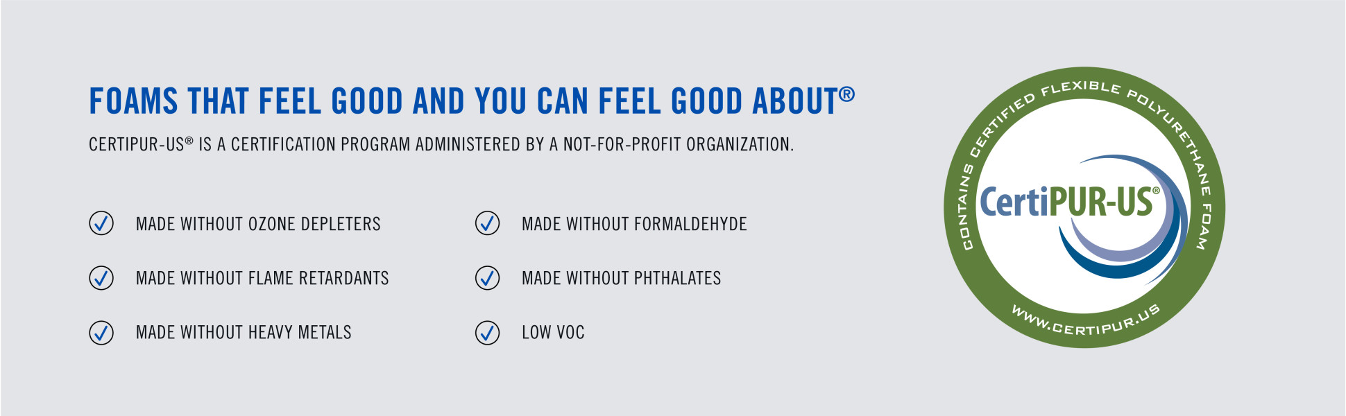 - CertiPUR-US® certified foam, ensuring the product is made without harmful chemicals and is tested by independent labs to meet rigorous standards for content, emissions, durability, and performance