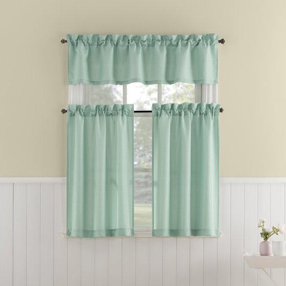Mainstays 3-Piece Textured Semi Sheer Rod Pocket Kitchen Window Tier Pair and Valance, 2 Café Curtains and 1 Curtain Valance, Aqua, 56"W x 36"L