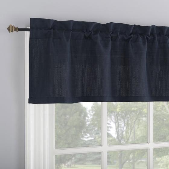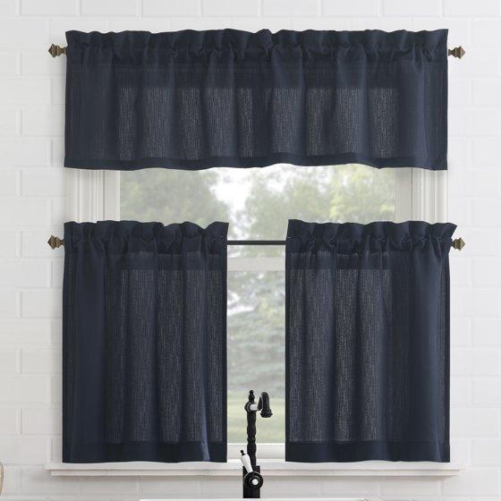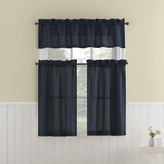 Enhance your kitchen, bathroom, or other small window with the Mainstays Textured Rod Pocket Kitchen Window Valance and Tiers Set. Casual textured fabric gently filters sunlight and enhances privacy. Simple rod pocket design allows for easy slide-through installation on curtain rods up to ¾" in diameter. Set includes 1 curtain valance and 2 tier curtains, measuring 56" width by 36" length. Measure carefully before selecting your desired size and quantity. Machine wash cold on gentle cycle. Use non-chlorine bleach when needed. Tumble dry on low heat, using a cool iron as needed.