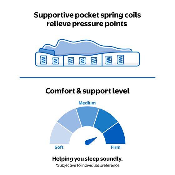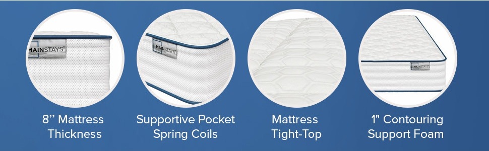 - SOOTHING PRESSURE POINT RELIEF: This Mainstays 8" Pocket Spring Mattress with ultra-soft, breathable quilted fabric cover and 1" contouring support foam adapts to your unique shape, cradling your body and relieving pressure points for restorative sleep