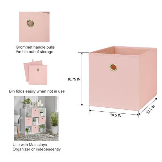 Our Mainstays Collapsible Fabric Storage Bins are just what you need to help you create an organized home. Perfect for storing kids to adult clothes, books, electronics and more, these bins' 10.5-inch by 10.5-inch by 10.75-inch size offers plenty of room to keep a wide variety of belongings neatly tucked away and their sturdy, round metal handle allows you to pull them off shelves with ease. You can utilize our Mainstays Storage Bins organizational expertise in your living room, bedroom, dorm room, or even your office. When not in use, you can easily fold the bin down flat and keep it stored away for later. The bins are made to fit with our Mainstays Cube Storage Organizers and are designed with a durable polyester fabric that holds their shape. With a variety of colors to choose from, you'll be able to perfectly match your home decor when you get organized with our Mainstays Collapsible Fabric Storage Bins.