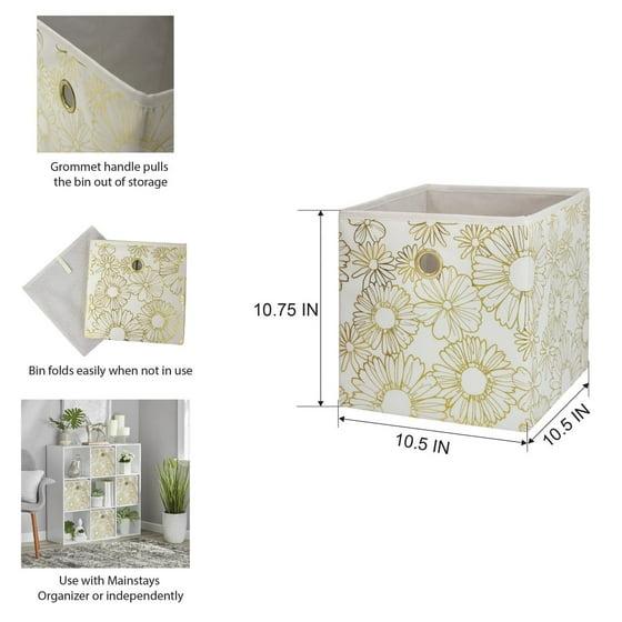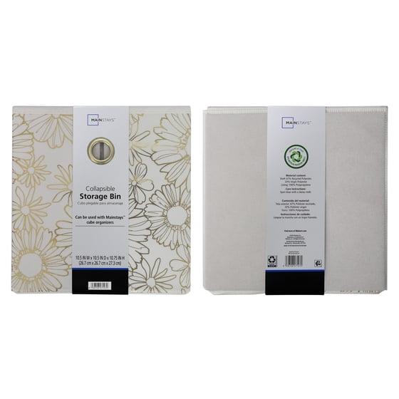 Our Mainstays Collapsible Fabric Storage Bins are just what you need to help you create an organized home. Perfect for storing kids to adult clothes, books, electronics and more, these bins' 10.5-inch by 10.5-inch by 10.75-inch size offers plenty of room to keep a wide variety of belongings neatly tucked away and their sturdy, round metal handle allows you to pull them off shelves with ease. You can utilize our Mainstays Storage Bins organizational expertise in your living room, bedroom, dorm room, or even your office. When not in use, you can easily fold the bin down flat and keep it stored away for later. The bins are made to fit with our Mainstays Cube Storage Organizers and are designed with a durable polyester fabric that holds their shape. With a variety of colors to choose from, you'll be able to perfectly match your home decor when you get organized with our Mainstays Collapsible Fabric Storage Bins.