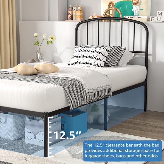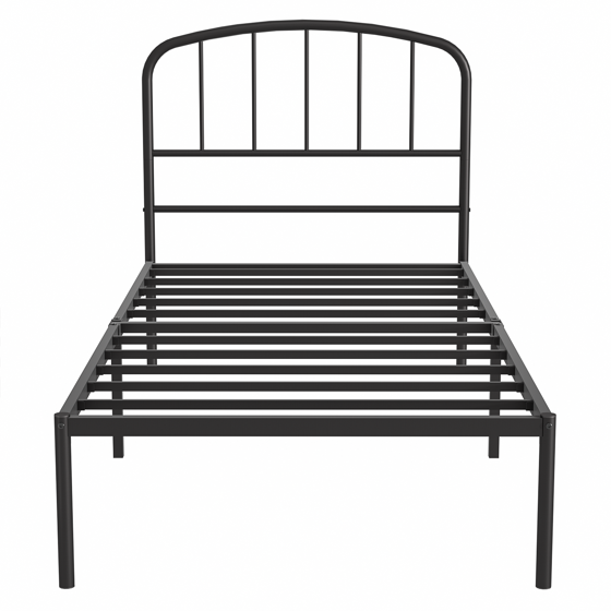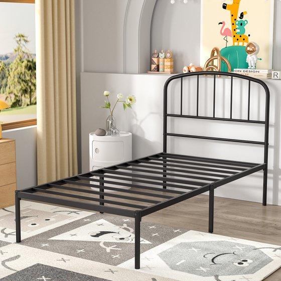 Mainstays crew twin metal platform bed with curved headboard, black, adult. Elegant and minimalist design, the bed frame features a sleek, modern aesthetic that effortlessly complements a variety of bedroom styles. It's clean lines and understated elegance make it suitable for minimalist, contemporary, or even classic interiors. Compared with other metal beds, this bed frame has a higher headboard for better protecting your head and providing you a comfortable sitting place. Carefully designed, this mattress foundation is built of round corners, smooth finish and protective footpads, which is safer for our customers to use. This robust bed base is fully constructed of metal frame for large load bearing capacity. Reliable frame features with 10 metal slats and 2 reinforcing tubes, which provides you with strong support for a relaxing sleep. The powder coated surface features medium rust and scratch resistance for long term use. besides, not shaky after proper assembly. We provide all the necessary hardware and tool, and an illustrated installation manual to help you set up this iron bed frame. Material, metal steel color is black, no boxing spring needed. Designed with a supportive slatted base, this bed frame eliminates the need for a box spring. Additionally, its 12.5 inch under bed clearance offers ample storage space. With simple assembly instructions and included tools, setup is a breeze, ensuring stability and long lasting use.